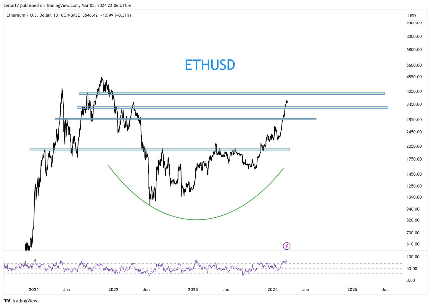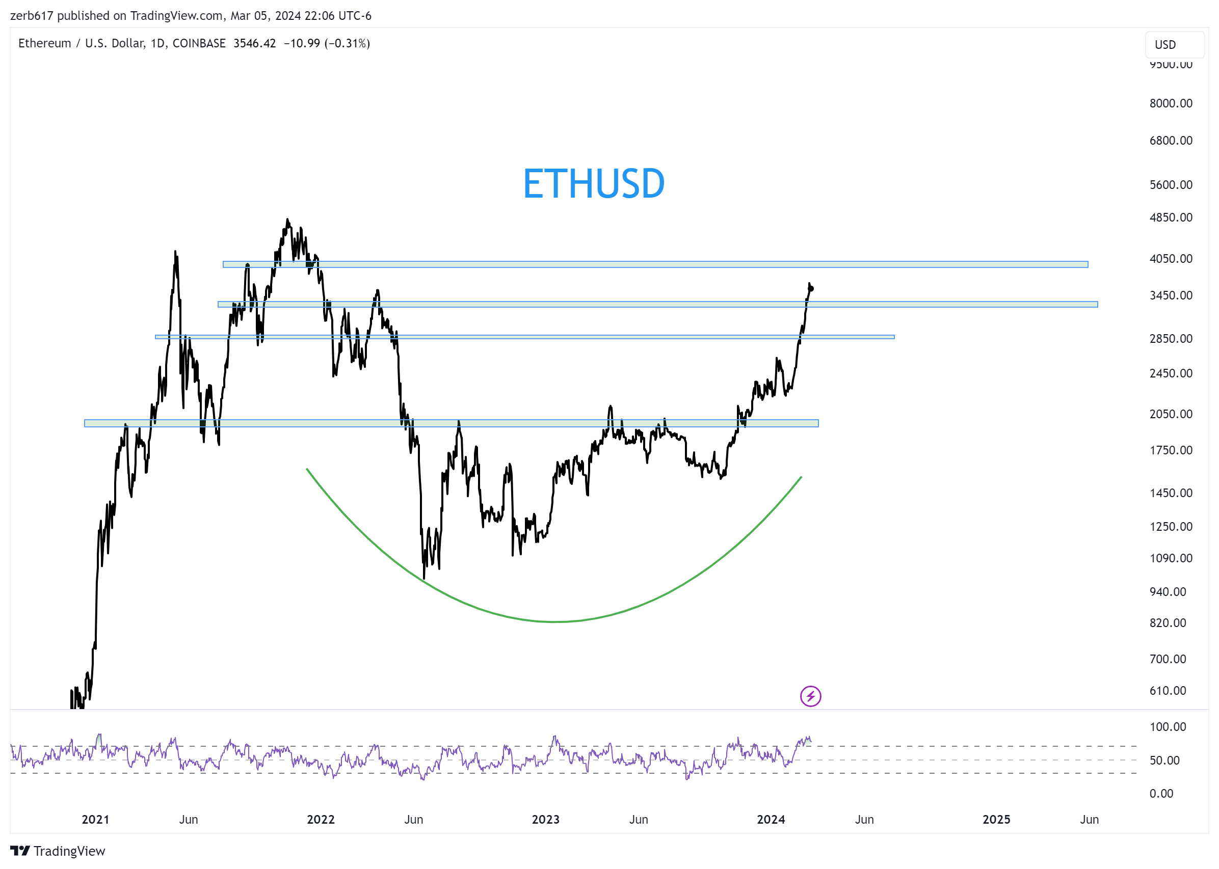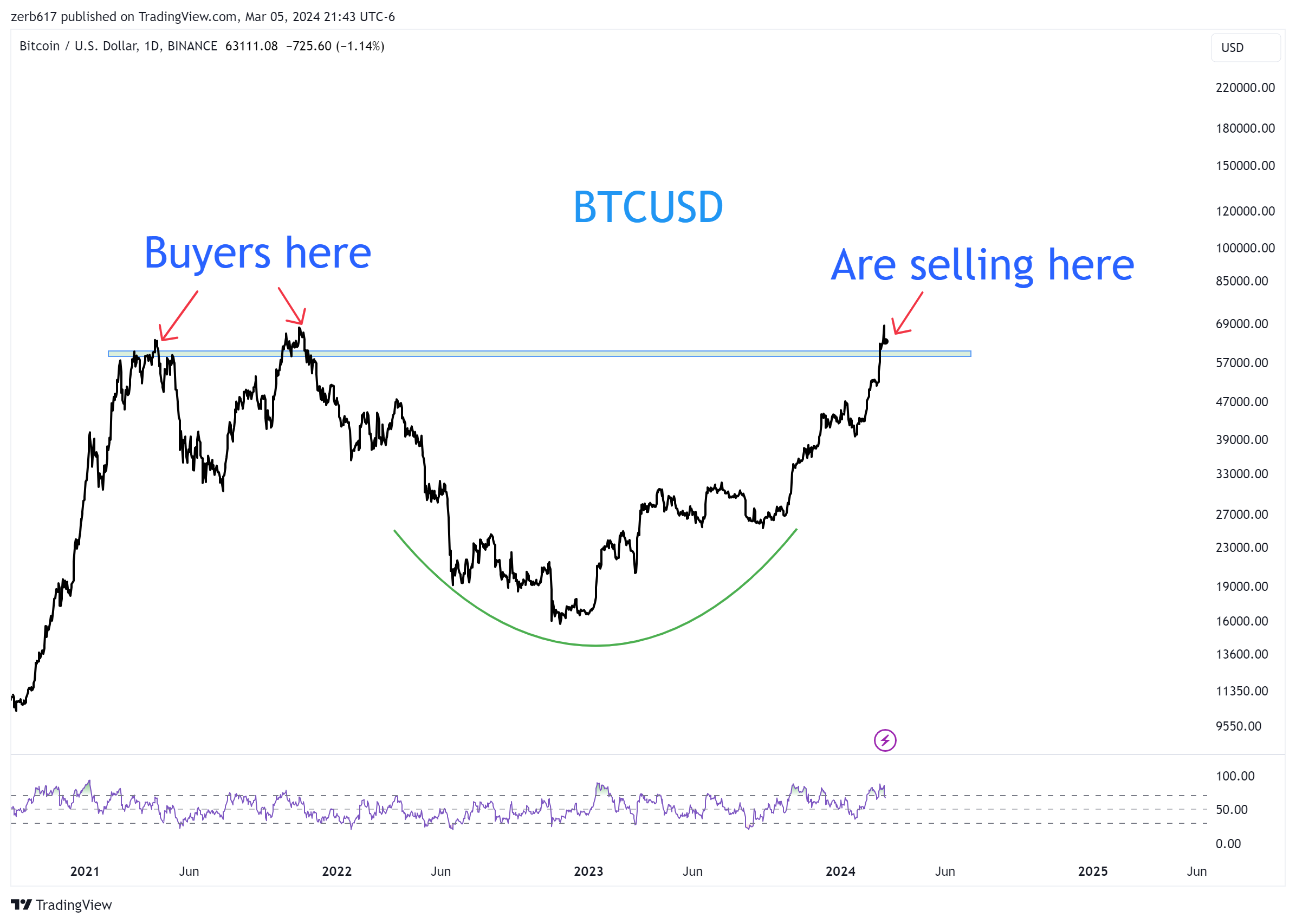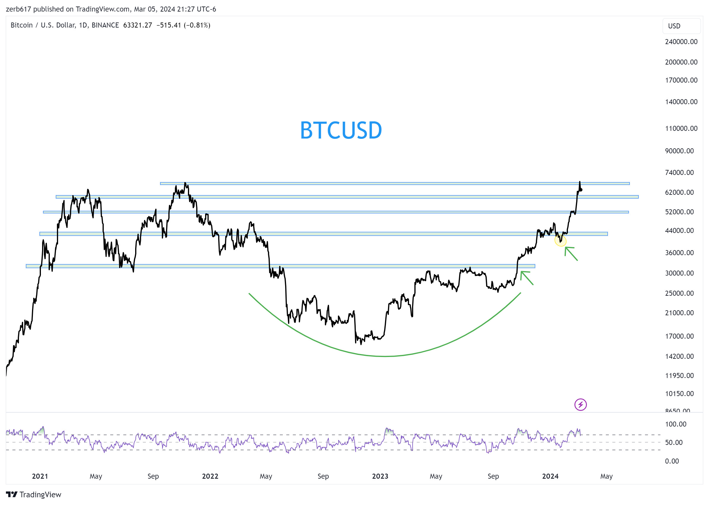 Bitcoin (BTCUSD) just broke out to new All-Time Highs. Sending the crypto bears back into hibernation. After the SEC approval of Bitcoin spot ETFs, many thought it was the beginning of the end for Bitcoin. The -16% drawdown we saw mid-January didn’t shake the faith, as folks rushed to buy up the newly created Bitcoin ETFs. Demand quickly outpaced supply as we rocketed off those levels.